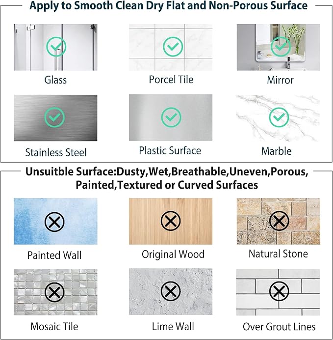 - 【Use Tips and Attention】This item works only on non-porous, smooth surfaces such as polished ceramic tiles, mirrors, glass windows, polished stainless steel surfaces, and plastic boards etc. It won't work on any porous, bumpy, rough or textured surfaces such as rough paint, unpolished marble or wooden surfaces, rough porcelain etc.