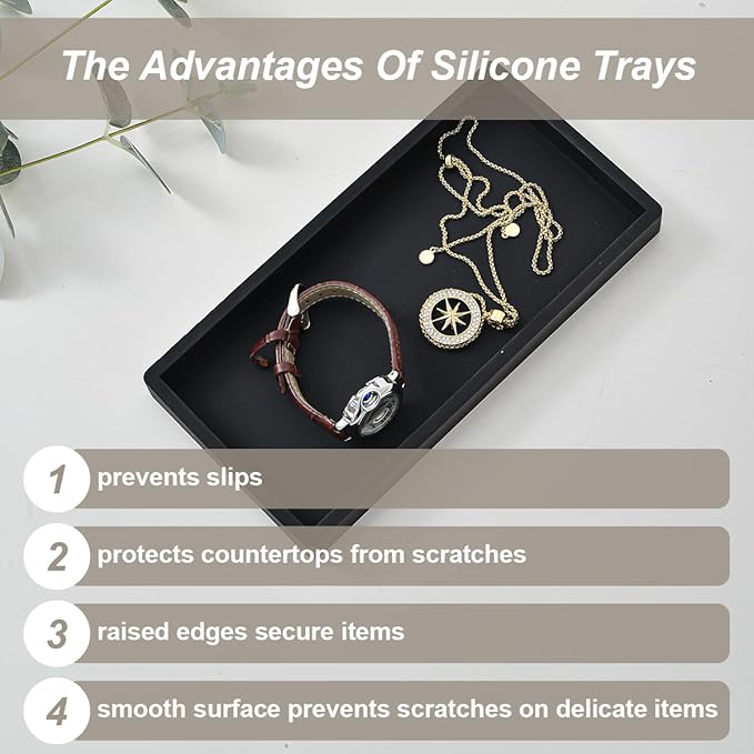 - 【Versatile for Multi-Surface Use】Use it as a soap and lotion tray on bathroom counters, a silicone tray for kitchen counter near sinks, or a tray for back of toilet to organize toiletries. The smooth surface prevents scratches on delicate items like jewelry or candles.