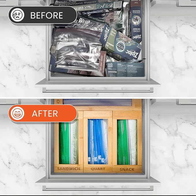 - Easy Refills with Removal Back - Refilling your baggie organizer has never been easier! Our bamboo bag storage holders come with a wooden removable back meaning no more struggle stuffing bags into other containers!