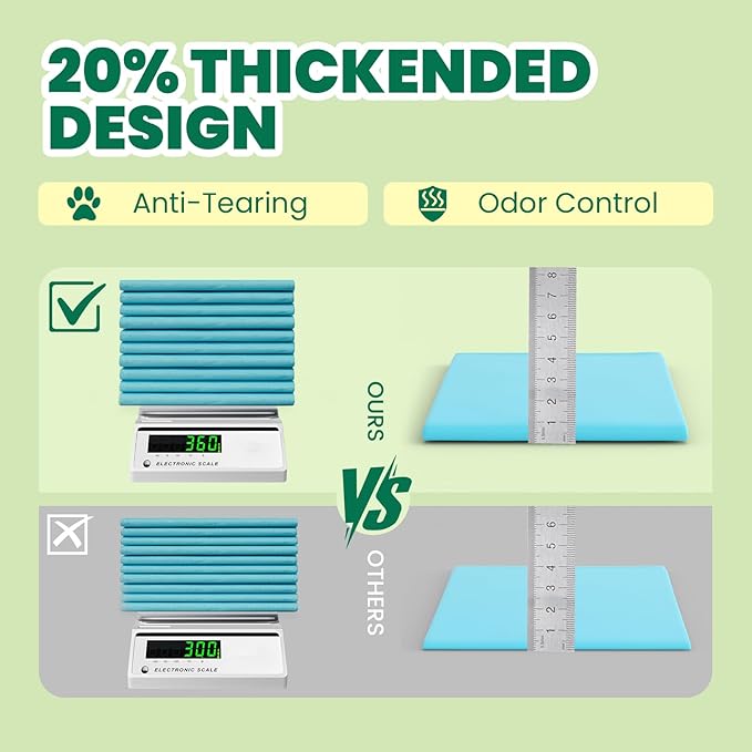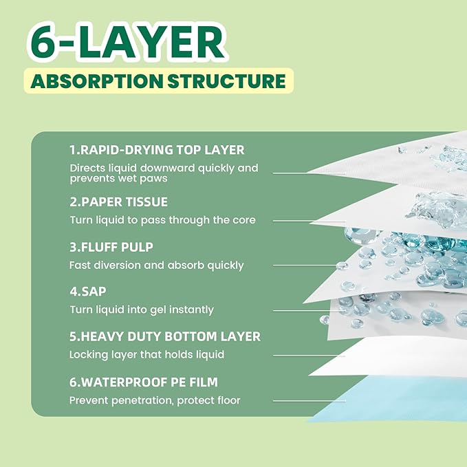- 【SUPER ABSORBENT & THICKER】The thickened wee wee pads and 6 layer protection design makes our dog pee pads more absorbent than the most puppy pads on the market.