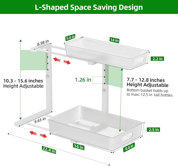 - Large Capacity and Versatile: The L-shaped design of the under-sink organizers optimizes space, providing a larger storage capacity. The height can be flexibly adjusted from 10.3 - 15.6 inches to fit different sized cabinets and store different sized items, maximizing the vertical space of the sink