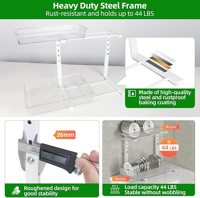 - Durable and Stable: Thickened steel frame and durable acrylic basket, and comes with four suction cups and two nano tapes to fix the position and prevent it from slipping out, able to withstand heavier loads while ensure lightweight of cabinet organizer, ensuring long-term use for all your storage needs under the sink
