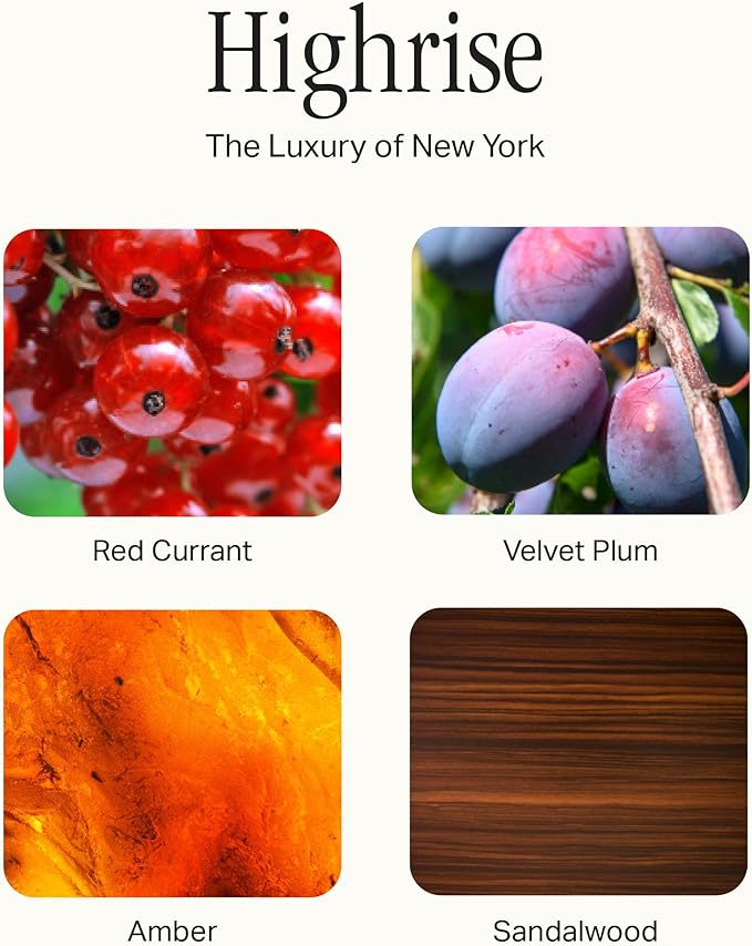 - SIGNATURE SCENT – HIGHRISE: A sleek, modern scent featuring Red Currant, Velvet Plum, and Amber — creating a rich, inviting fragrance that captures the pulse of contemporary city life