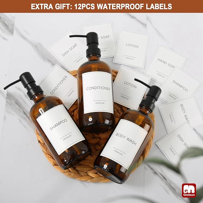 GMISUN Shampoo and Conditioner Dispenser, 3 Pack Amber Glass Bathroom Shampoo Conditioner Body Wash Dispenser with Pump for Shower, 17 Fl Oz Hand Soap Dish Soap and Lotion Dispenser Set for Kitchen