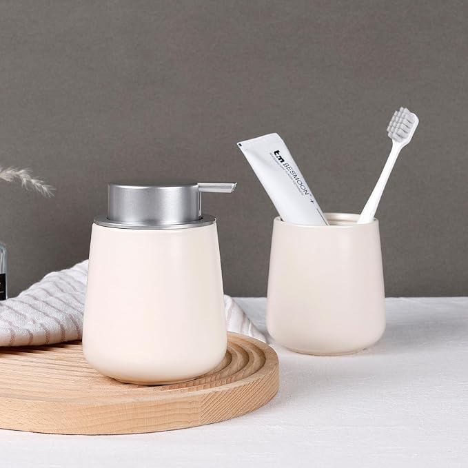 BosilunLife Hand Soap Dispenser - Beige & Grey 12Oz Ceramic Soap Dispenser Bathroom Refillable Liquid Dispenser for Dish Soap with Easy-to-Press Pump