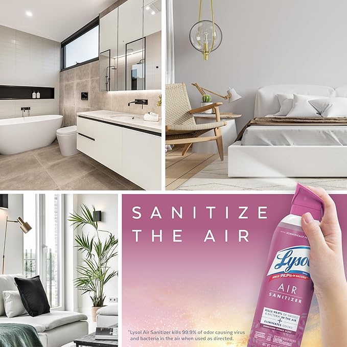 - SANITIZE THE AIR THROUGHOUT YOUR HOME: Lysol Air Sanitizer Spray sanitizes and eliminates 99.9% of odor causing bacteria* in the air. Enjoy the sunkissed petals scent. (*Use as directed).