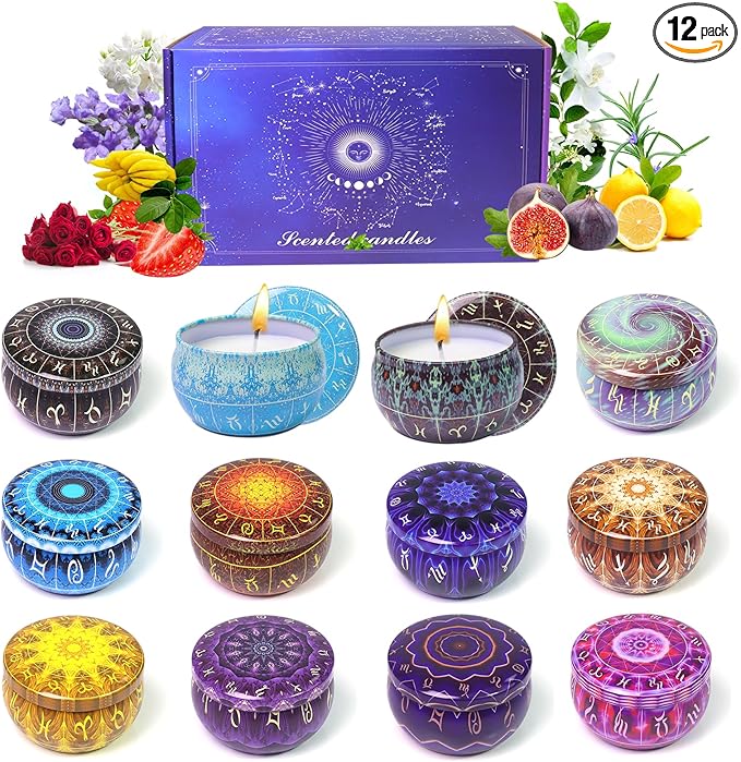 - ๐12 Zodiac Soy Wax Scented Candle Sets - with 8% essential oils,12 scents Vanilla, Gardenia, Bergamot, Peppermint, Rose, Mediterranean Fig, Rosemary, Jasmine, Spring, Strawberry, Lemon, Lavender ,perfect for yoga meditation & bedroom ambiance