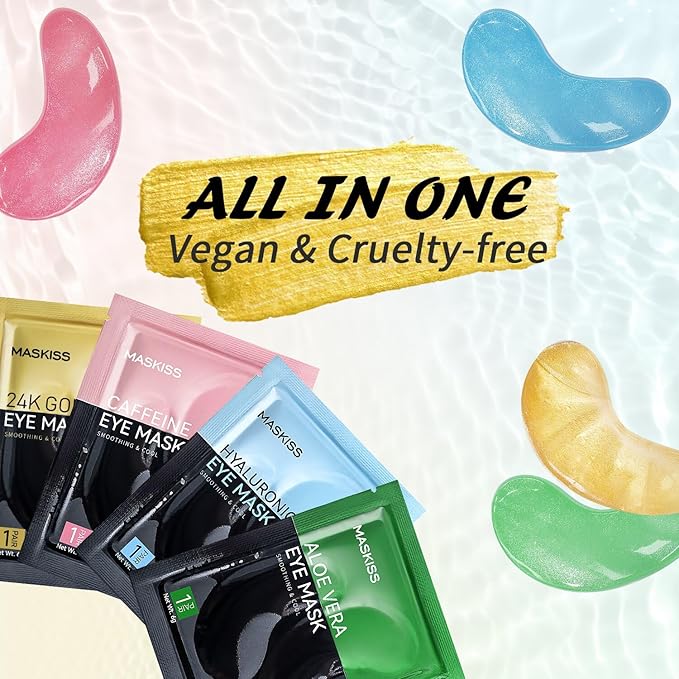 - Comprehensive Eye Care Treatment: The Maskiss set includes 4 colors, 8 pairs of under-eye patches. 24k Gold eye mask helps to smooth the skin, reduce fine lines and wrinkles. Caffeine eye patches help promotes eye metabolism and circulation, and reduces eye bags and puffy eyes. Hyaluronic acid eye masks help to fade dry lines and wrinkles, and locks in moisture and nutrition. Aloe vera eye patch helps to reduce pigmentation, repair the healing barrier, and gently moisturize the skin. Add these to your daily self-care routine for a visibly younger, well-rested appearance.