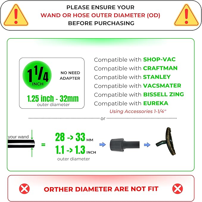 - 1-1/4'' Shop Vac Attachments: With vacuum hose adapter, we offer solution for your fitting issue. This vacuum accessories can fit all shop vac using 1-1/4''