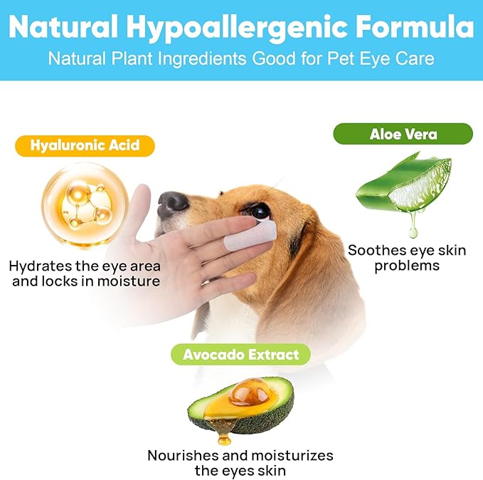 - SAFE & NATURAL INGREDIENTS - Our dog eye wipes made with all-natural ingredients formula contained with natural plant enzymes, aloe vera, avocado extract, and hyaluronic acid, our pet eye wipes for dogs are gentle and non-irritating, they are especially suited for sensitive skin. No-rinse formula, no worry about even if licked or ingested by pets.