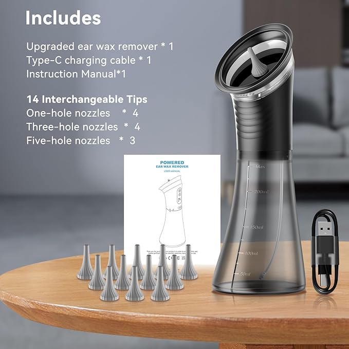 - 【Ear cleaning kit contains】: Upgraded ear wax remover * 1, One-hole nozzles * 4, Three-hole nozzles * 4, Five-hole nozzles * 4, Type-C charging cable * 1, Instruction Manual * 1