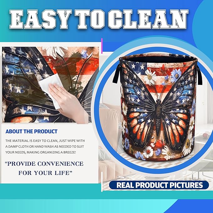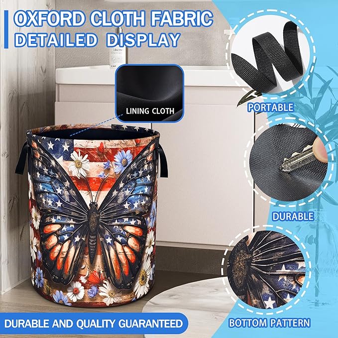 American Flag Butterfly Laundry Basket Daisy Flowers Oxford Cloth Laundry Hamper With Handle Foldable Portable Clothes Storage Basket 18.9 X 16.5 Inch Storage Bag For Laundry Room/Bathroom/Bedroom