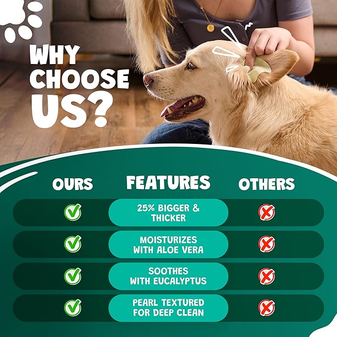 - 25% larger and more durable than standard wipes, these ear cleaner wipes for dogs provide effective coverage for thorough cleaning. The pearl-textured design ensures a gentle yet efficient clean with every use.