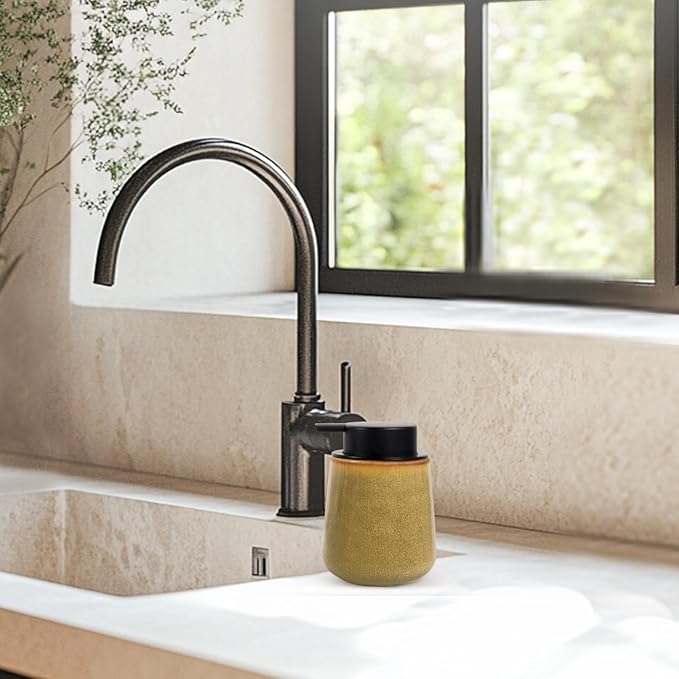 INGOFIN Ceramic Lotion Dispenser - 12 oz Refillable Hand Soap Dispenser Bathroom, Modern Liquid Soap Dispenser with Pump, Dish Dispenser for Kitchen,Kiln-Glazed Earthy Yellow