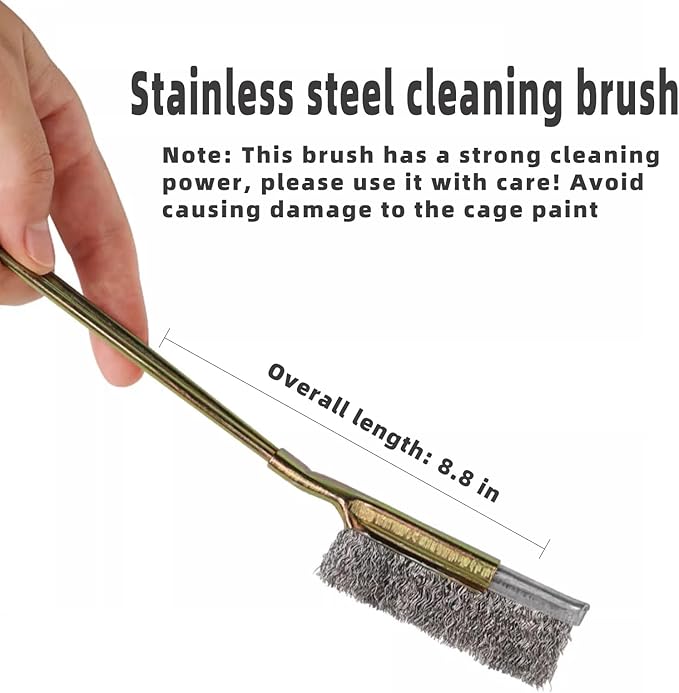 - Dimensions: (1) Stainless steel cleaning shovel is 6.5 inches long and 1.8 inches wide (2) Cage post cleaning tool is 9.5 inches long (3) Stainless steel wire brush is 8.8 inches long (4) Multi-purpose brush is 6.3 inches long (5) The small broom is 7.3 inches long and 4.7 inches wide