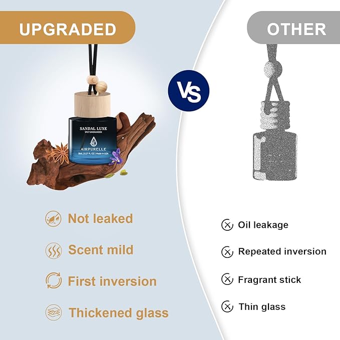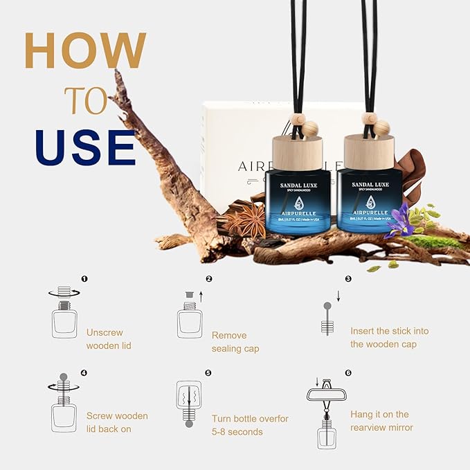 - 【Aromatic Variety】The scents of our car air fresheners are Citrus Musk, Spicy Sandalwood, Saffron Amber, Amber Vanilla and Woody Citrus, from sweet fruit aroma to intense woody aromas, They are all the most popular perfumes on the market, from fashionable urban women to successful mature men, AirPurelle car air freshener there is always a fragrance that belongs to you