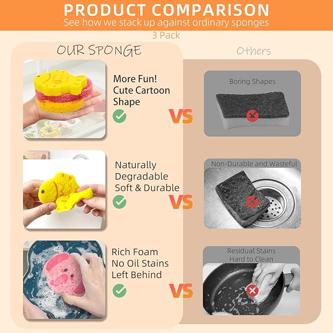 - Versatile and Easy to Use: Whether tackling your kitchen dishes, countertops, or even bathroom surfaces, this sponge is a versatile companion for all your cleaning jobs—wrapped in an irresistibly cute package!
