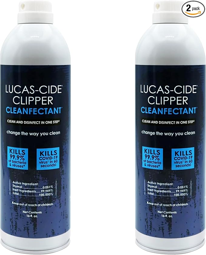 - LUCAS-CIDE clipper cleaner spray with disinfectant.