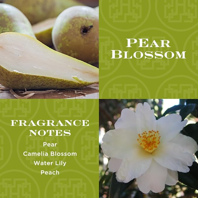 - PEAR BLOSSOM: Sweet peach and gentle pear blossoms are gracefully layered with waterlily and the essence of cucumber creating this delicate scent.