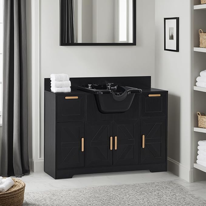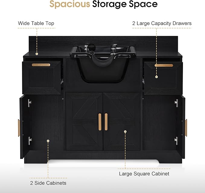 - [Spacious Storage Space]: The unit features the wide tabletop and two large-capacity drawers, providing generous storage space for shampoos, conditioners, towels, combs, and other barber tools. Additionally, a large square cabinet and two side cabinets, offering further storage flexibility and convenience.