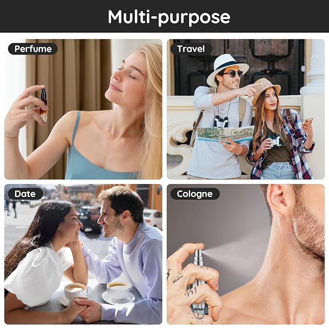 - Multi-application: Great for perfume, fragrances, cologne, face spray, toiletries product, various water-based liquids in mind. A necessary cosmetic accessory for daily activity, especially for traveling and outgoing