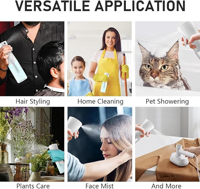 - All-Angle Spraying, All-Purpose Functionality - Mist with precision, even upside down. The 360° spray nozzle reaches tricky spots with ease, making it ideal for hair styling, plant care, pet grooming, cleaning, or refreshing your space with essential oils.