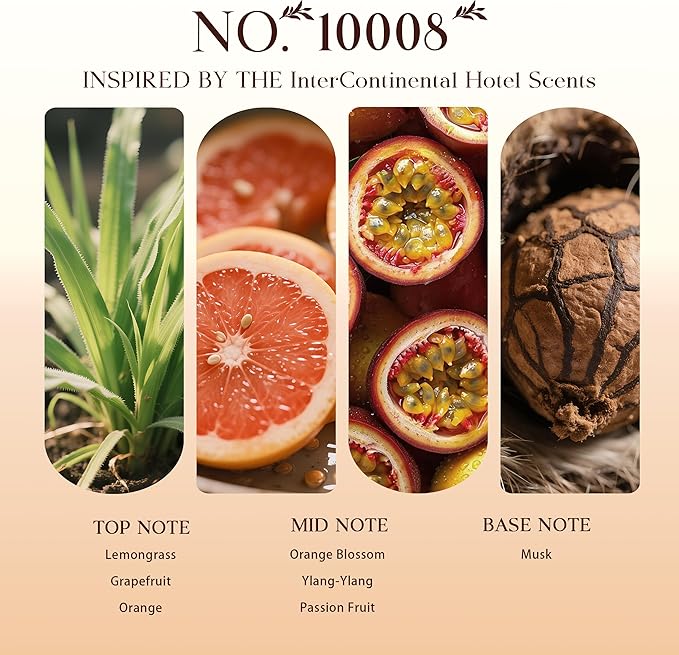 - Fresh Clean and Long lasting: No. 10008 The InterContinental Diffuser Oils are top notes of freshness and the middle and bottom notes of calmness. The scent of these hotel essential oils is fresh, clean, and free of alcohol/mineral oils, with a pure and non-abrasive aroma that will make your home smell elegant and clean! And compared to ordinary aromatherapy oils, the fragrance time is extended by 50%, 3-5 drops can cover 100 square meters of space, small dosage big effect!