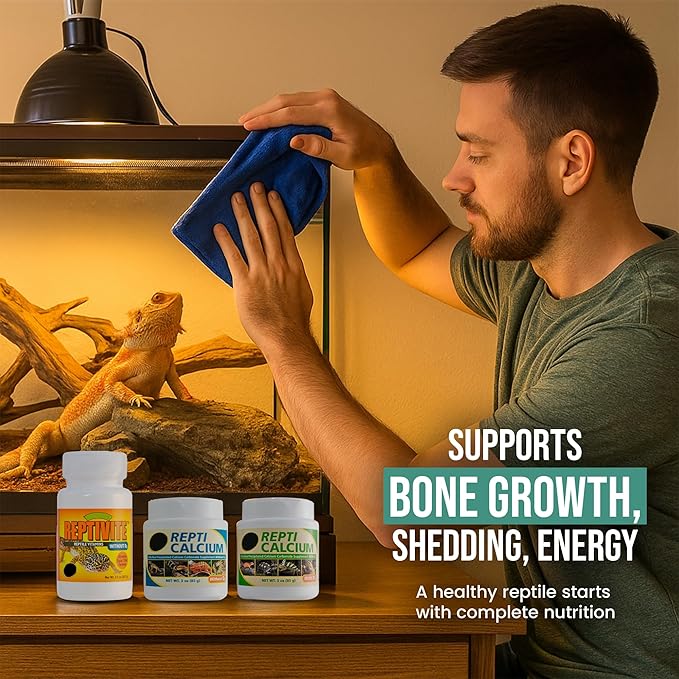 Repti Calcium with D3 (3 oz), Repti Calcium Without D3 (3 oz), and Reptivite Without D3 (2 oz) for Reptiles, Includes Trinity Treats Microfiber Cleaning Cloth