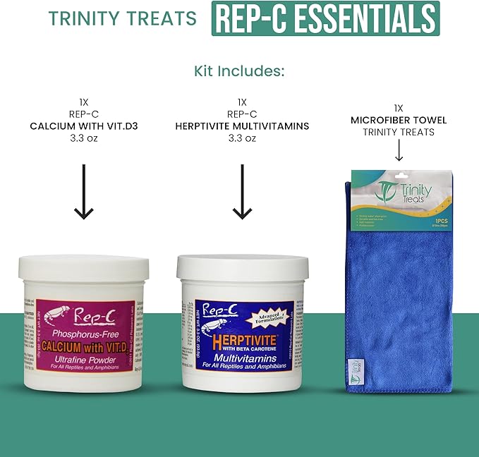 - This Trinity Treats Herptivite multivitamin for reptiles 3.3 oz, Reptile Calcium with D3 3.3 oz for reptiles and amphibians includes 3 items: The Herptivite multivitamin for reptiles 3.3 oz, The Reptile Calcium with D3 3.3 oz and 1 Trinity Treats Microfiber Cleaning Cloth.