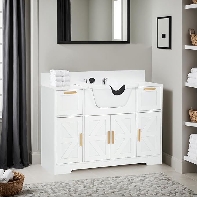 - [Spacious Storage Space]: The unit features the wide tabletop and two large-capacity drawers, providing generous storage space for shampoos, conditioners, towels, combs, and other barber tools. Additionally, a large square cabinet and two side cabinets, offering further storage flexibility and convenience.