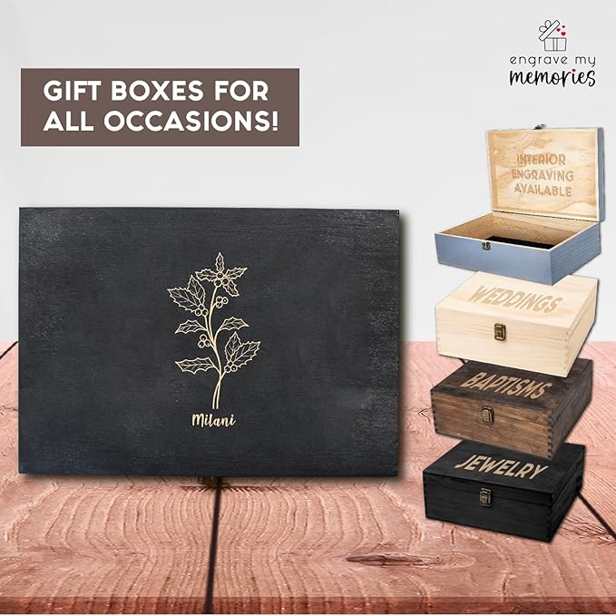 - Fully Customized - Click “Customize Now” to choose from 12 elegant birth flower designs (one for each month), available in 4 beautiful wood finishes—Dark Walnut, Gray, Natural, and Ebony. Select the perfect size for your needs: Small, Medium, Large, or Extra Large—from compact jewelry boxes to spacious keepsake chests. Optional inside engraving available for an extra heartfelt touch.