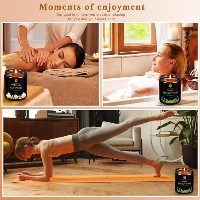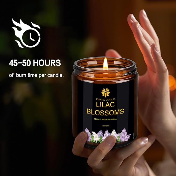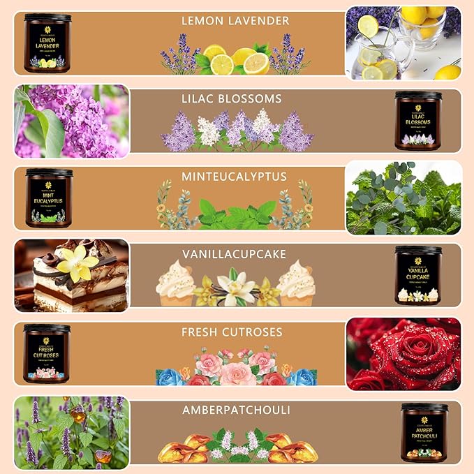 - 6-Pack Natural Soy Wax - This home scented candle set selects 6 natural scents such as Lemon Lavender, Amber Patchouli, Eucalyptus Mint, Vanilla , Fresh Roses, Lilac, made of pure natural soy wax. The fragrance can soothe emotions and is an ideal gift choice to convey your heart. Our aromatherapy candle set is suitable for many occasions such as birthday parties, friends gatherings, candlelight dinners, graduation ceremonies, camping, climbing, etc. Let the scented candles add a warm atmosphere to your friends, family and you to spend a good time.