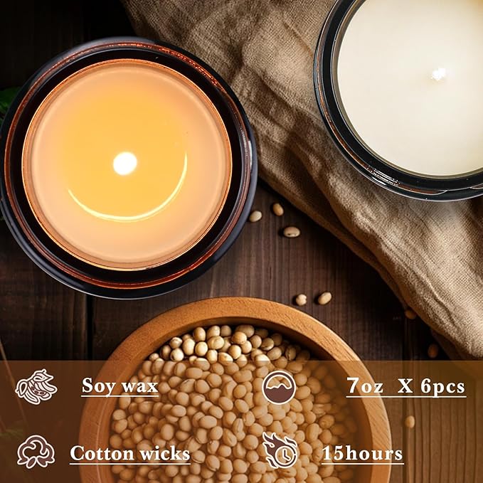 - Long Lasting Burning - Each 7.05 ounce candles for home scented can burn for 45-50 hours, and the total duration of 6 jar candle is about 300 hours. When you light the soy candle, the fragrance will spread the fragrance to the greatest extent and fill the entire space, allowing you to relax your tired mood when you return home and soothe your body and mind. Scented candles bring a quiet and comfortable atmosphere.High-quality cotton wicks ensure clean burning, the soy wax formula is environmentally friendly and pollution-free, and the fragrance is released evenly and lastingly.