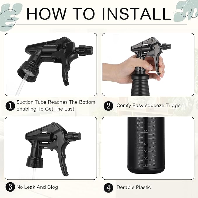 - Leak-proof Sprayer: these black spray bottles for cleaning are equipped with a strong trigger and adjustable nozzle, single stream, atomized spray and two "off" positions are available, easy to use, just gently turn the nozzle to adjust; Note: please switch "off" to "spray" or "stream" before use
