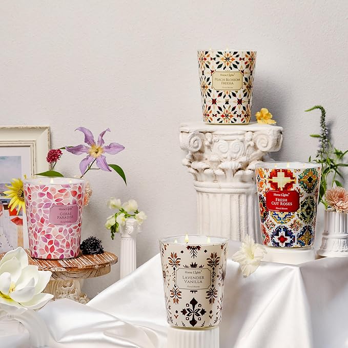 HomeLights 3-Wick Candles for Home Scented - 34oz Soy Wax Blend Candle Long-Lasting Fragrance, Bohemian Natural Textures Home Decor and Housewarming Gifts, Peach Blossom Freesia