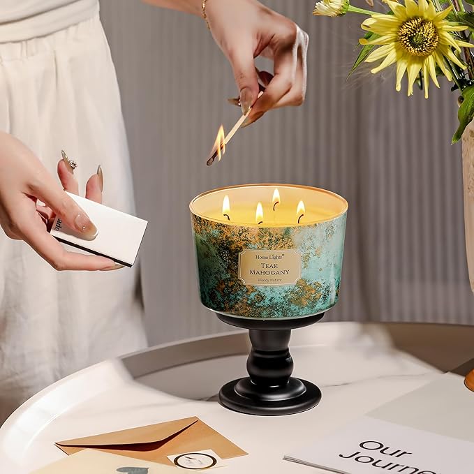 HomeLights Large jar Candle | 4-Wick Long-Lasting Scented Candles, 18oz Natural Soy Wax Candle for Home Scented, Industrial Chic Gifts for Women & Men, Teak Mahogany