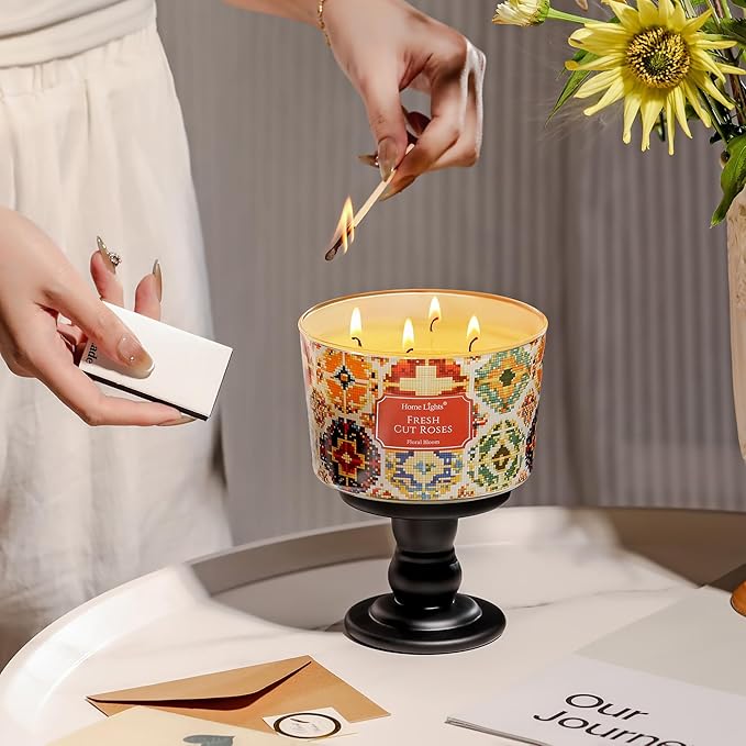 HomeLights 4-Wick Candles for Home Scented - 18oz Soy Wax Blend Candle Long-Lasting Fragrance, Bohemian Natural Textures Home Decor and Housewarming Gifts, Fresh Cut Roses