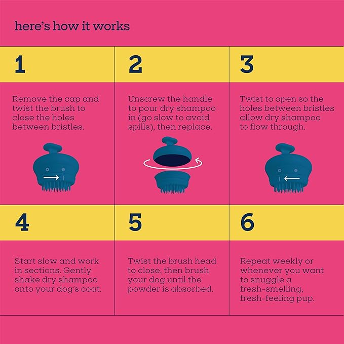 - DEEP-CLEAN DESIGN Applies dry shampoo through the coat and down to the skin, removing dirt and oil from pup's skin and coat