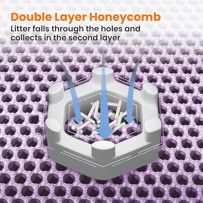 - Double Layer Honeycomb Structure: The holes in the top layer trap all types of litter and let it fall through to the waterproof bottom layer for effortless cleanup. Just lift litter catcher mat, pour the collected litter back, and reuse — no mess, no hassle. This smart design helps reduce litter waste and makes daily cleaning faster and easier!