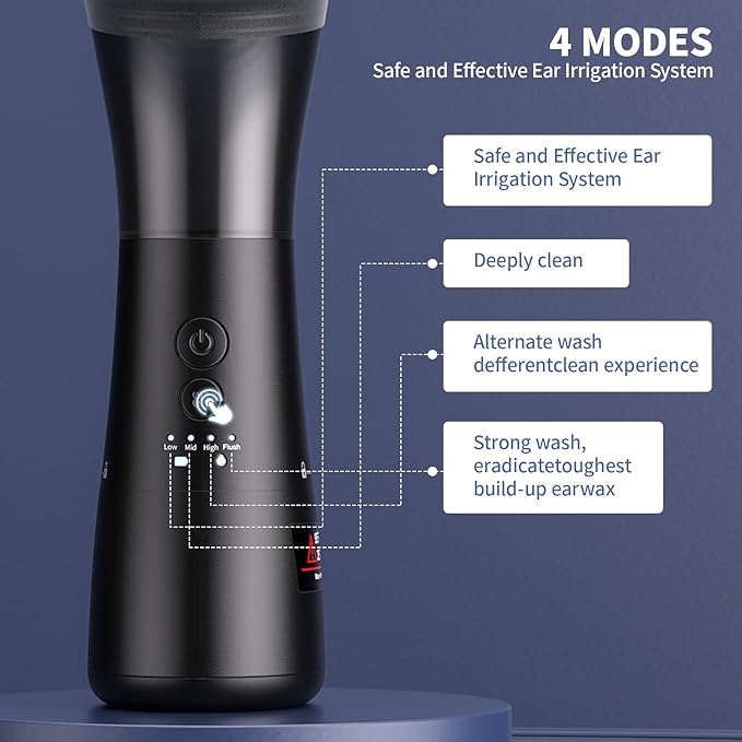 - Four Cleaning Modes: Choose from Low (Soft Mode), Medium (Normal Mode), High (Pulse Mode), and Flush (Ear Bath mode) to personalize your cleaning experience. Whether you prefer a gentle rinse or thorough cleansing, there’s a setting for every need.