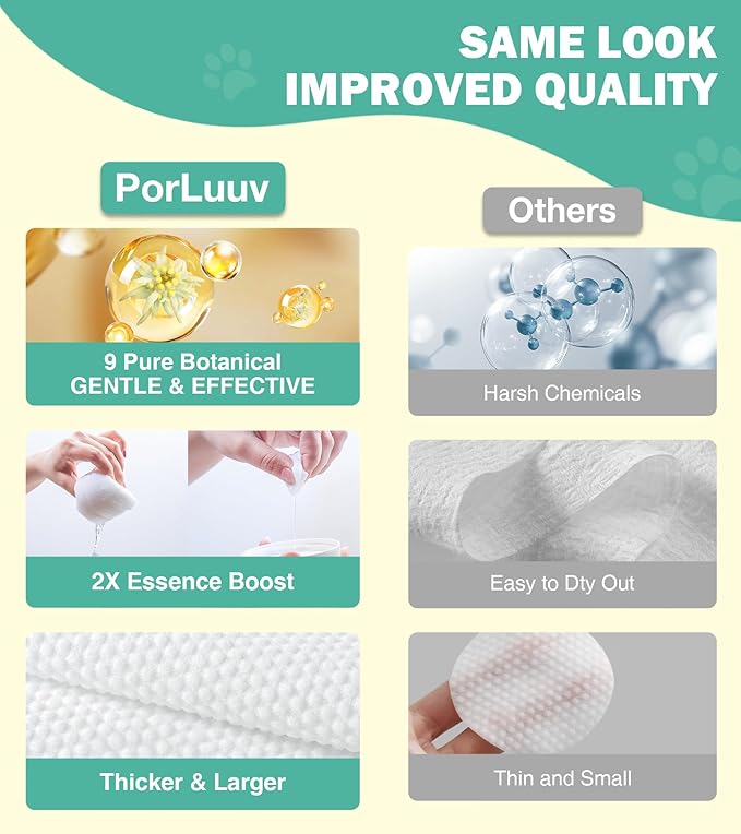 - 【Pro Tear Stain & Debris Removal】Gentle yet powerful dog tear stain remover wipes effectively clear crust, discharge, and debris while fading tear/saliva stains. Enriched with double essence formula, they soothe itching, repair skin barriers, and boost eye resistance, reducing infection risks. Safe for daily use on dogs, cats, and rabbits. Tested on 500+ breeds, it’s the vet-recommended tear stain remover for dogs