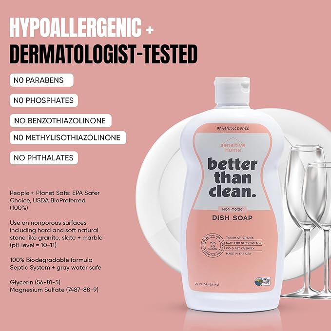 - Sensitive Yet Strong – Dish Soap That Cares: Cleans the greasiest dishes without harsh chemicals or skin irritation. A top choice for sensitive skin and sensitive homes.