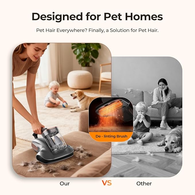 - 【Powerful Suction & High-Frequency Tapping】Driven by a 150W brushless dual-motor system, our cordless bed vacuum cleaner delivers 10KPa suction power and 80,000 high-frequency taps per minute—over twice the speed of other vacuum cleaners. The ultra-long tapping bar and dual suction ports work together to effectively remove deeply embedded particles and residues from fabrics, covering 30% more surface area per pass for thorough results.