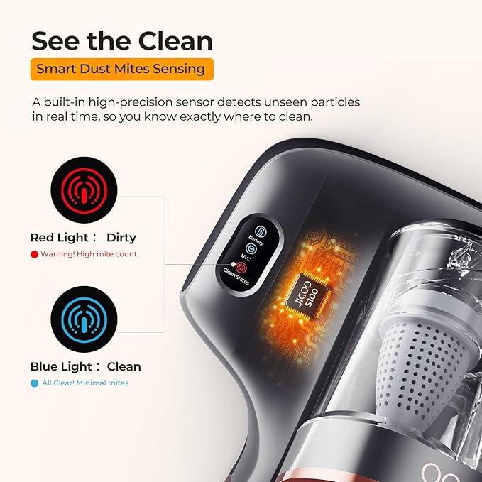 - 【Cordless, Lightweight Design for Handier Cleaning】The JIGOO S100 Cordless Mattress Vacuum Cleaner offers you great convenience and ease of use during cleaning, as you don’t have to worry about finding an outlet or dealing with a cord getting in the way, making it easier to maneuver and clean hard-to-reach areas. With a lightweight construction, it is easier to operate and carry around.