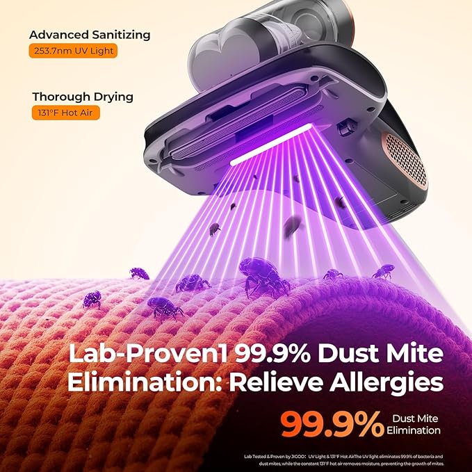 - 【Heat Refresh & Safety Assurance】The S100 uses 55°C warm air to reduce moisture and odors in fabrics, ideal for humid environments. Integrated safety features include a 253.7nm UV light that activates only on surface contact and shuts off when lifted, plus overheating protection and motor lock prevention. Backed by a 20-minute runtime and USB-C fast charging, it’s CE-certified for reliability.