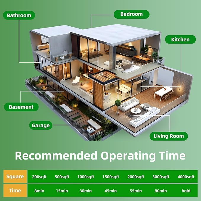 - 【Dual Turbo Fan System | Powerful Air Purification】Featuring front-and-rear dual turbo fans with a massive ozone output of 98,000 mg/h, this system delivers ozone faster and farther than single-fan models. It increases air purification speed by 50% and extends coverage by 40%, reaching up to 5,000 sq. ft. The system rapidly eliminates odors and restores clean, breathable air, ideal for large spaces