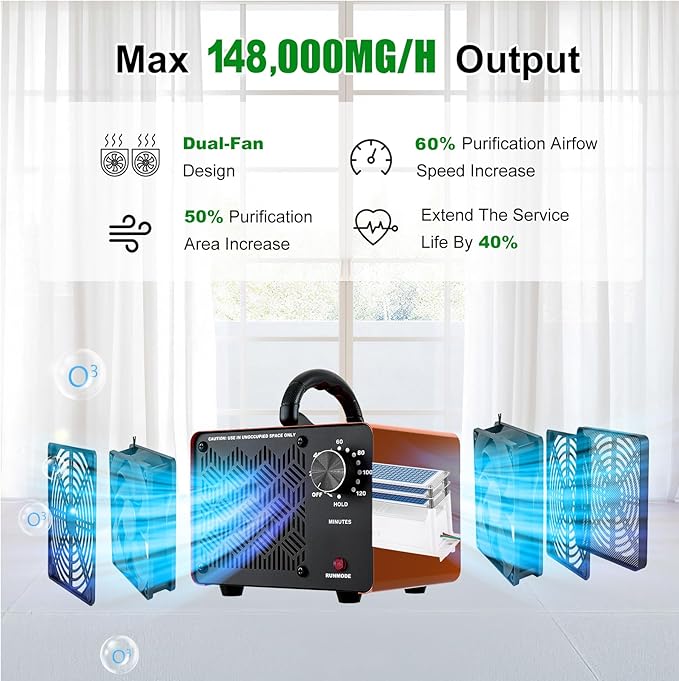 - 【Dual Turbo Fan System | Powerful Air Purification】Featuring front-and-rear dual turbo fans with a massive ozone output of 148,000 mg/h, this system delivers ozone faster and farther than single-fan models. It increases air purification speed by 60% and extends coverage by 50%, reaching up to 6,000 sq. ft. The system rapidly eliminates odors and restores clean, breathable air, ideal for large spaces