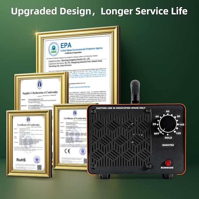 - 【Easy to Use | Safe for Unoccupied Use】Simply set the timer knob (up to 120 minutes) according to your space size. The ozone eliminator will shut off automatically when finished. Ensure all people and pets are removed before use, ventilate for at least 40 minutes after use before reentering