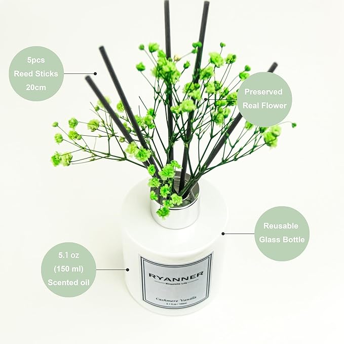 - 【Reed Diffuser Set】Includes 5.1fl oz mixture of essential oils combined with fragrance, one pc. of real preserved green baby's breath flowers,5 fiber sticks with high volatility.Adjust the amount of aroma released by adding or removing the sticks.