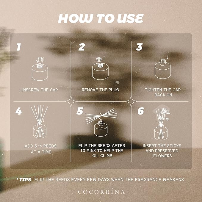 - Includes: This set includes a beautifully crafted glass diffuser bottle, 6.7 fl oz of premium fragrance oil, a preserved baby's breath flower for a delicate decorative touch, and 8 natural cotton reeds. Adjust the scent intensity to your liking by adding or removing reeds.